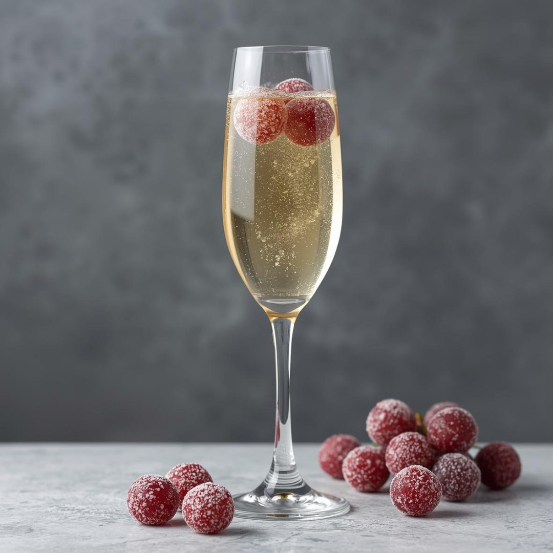 Put the sugar in a shallow dish. Rinse the grapes, leaving them damp, and roll them in the sugar until they are coated. Set aside to allow the sugar to harden. Pour the vodka and orange liqueur into a champagne flute and add the sparkling grape juice until the glass is filled a little more than half way. Top off with champagne and add the bitters, if using. Garnish with your frosted grapes. (You can skewer these and place them on top of the glass if desired).